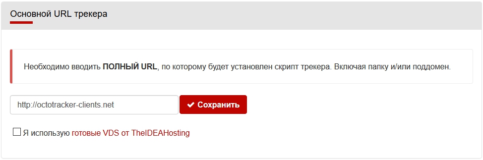 - Укажите на странице ПОЛНЫЙ URL, по которому будет установлен скрипт трекера, включая папку и/или поддомен (если есть).